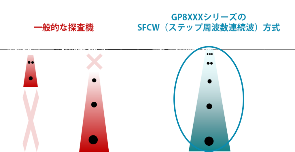 ・ステップ周波数連続波(SFCW)を使用する事により浅くて細かい部分から深いところまで探査が可能