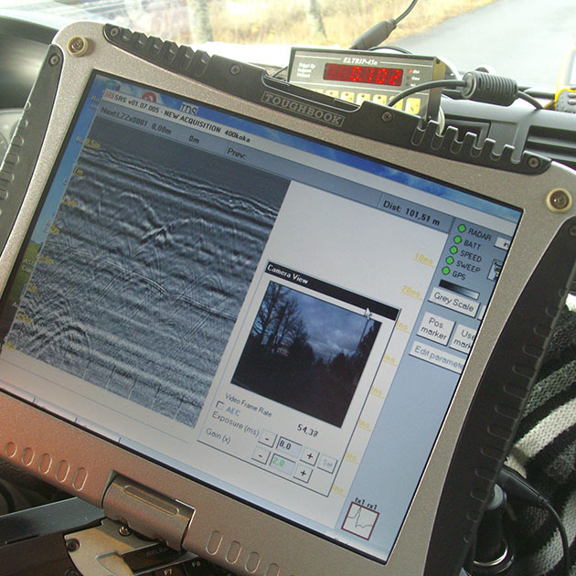 高速道路等で舗装厚さの計測が可能です。