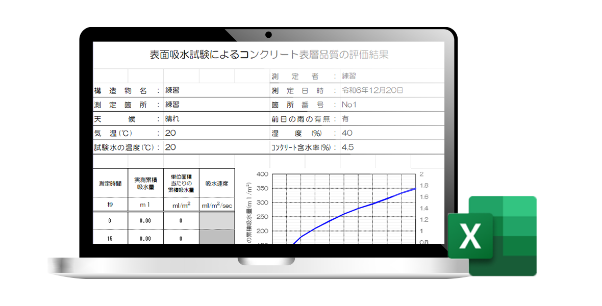 「概要記入シート」、「測定値記入シート」、「600秒時の吸水速度計算結果」にシートが分かれたExcelファイルとなっております。